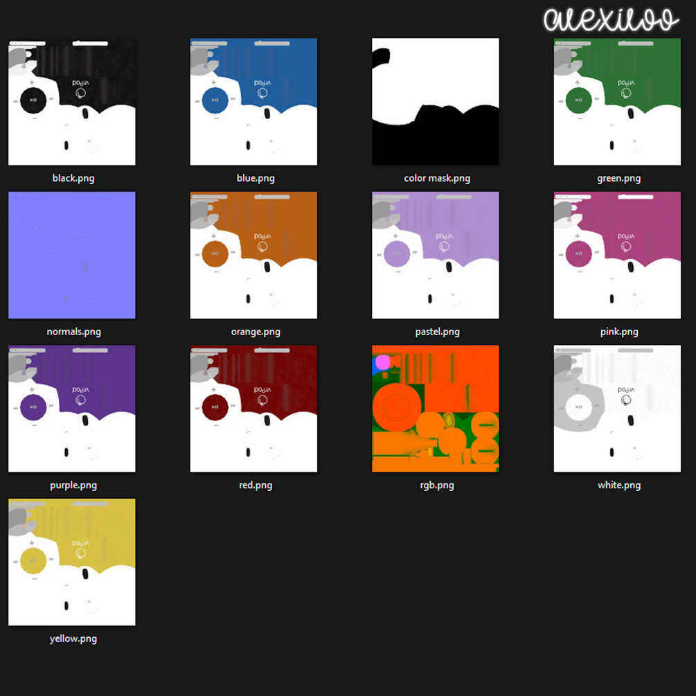 Contains textures for: pink, black, white, purple, blue, green, red, yellow orange, pastel purple